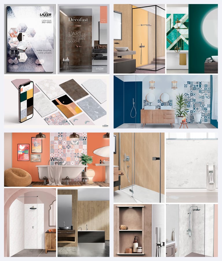 Création de gammes de visuels muraux pour impression support adhésif avec mise au raccord horizontal et vertical. Les impressions sont plaquées sur des supports en dibond de plusieurs formats selon leurs usages : mur, douche, niche, baignoire, crédence ...